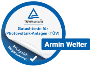 Mein Name ist Armin Welter und ich bin TÜV-zertifizierter Sachverständiger für Photovoltaik.
